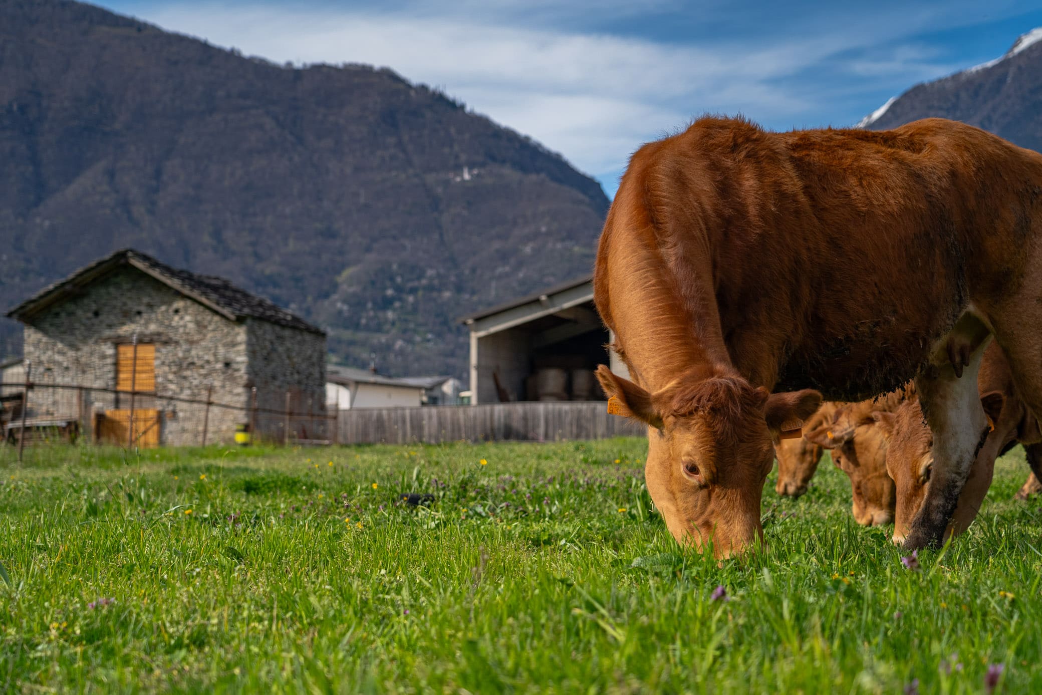 Dal 1995 le nostre mucche godono di un'esistenza serena e senza stress, pascolando nei prati verdi della Valchiavenna durante l'estate e nutrendosi di solo fieno, cereali e farina di mais in Stalla durante inverno.